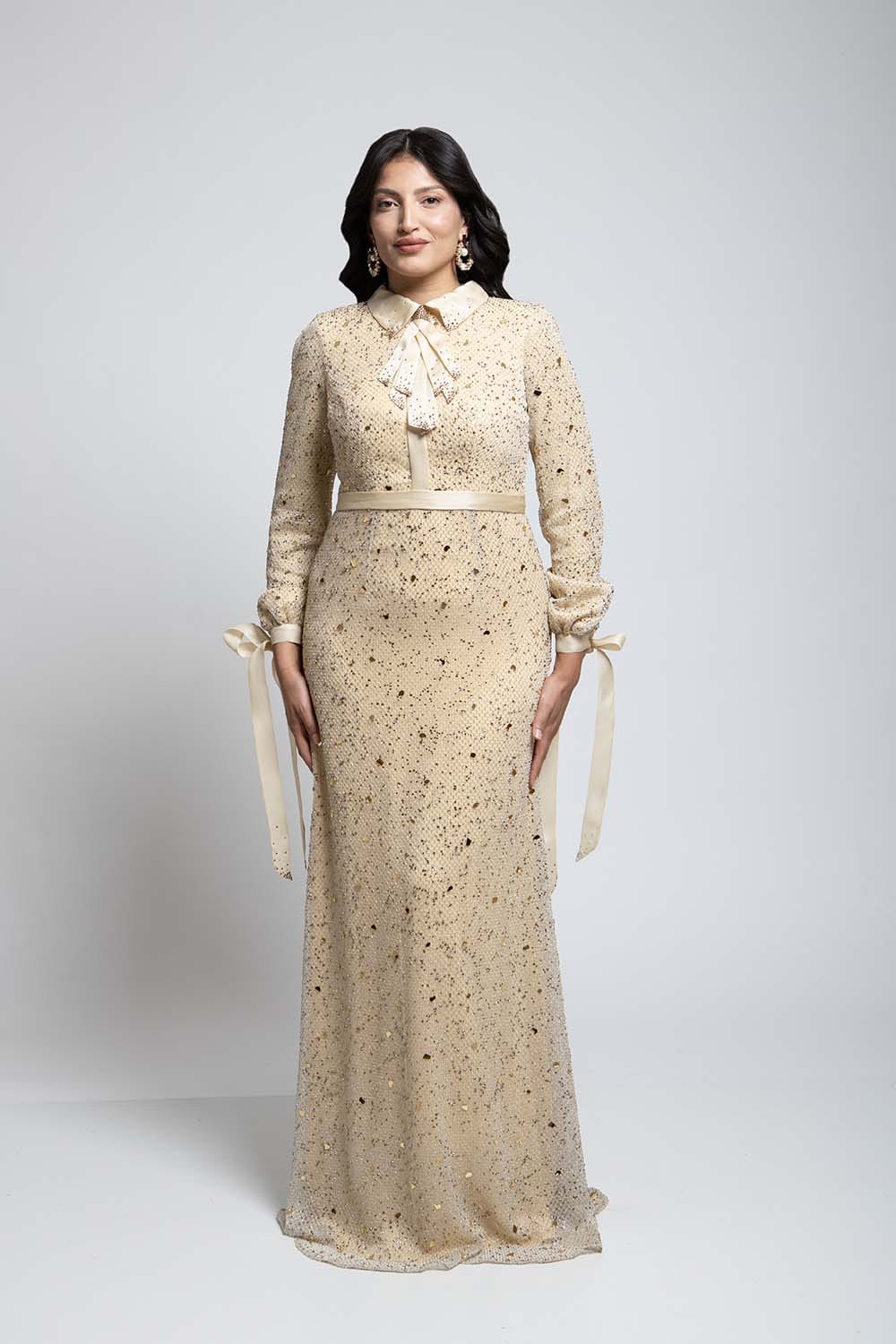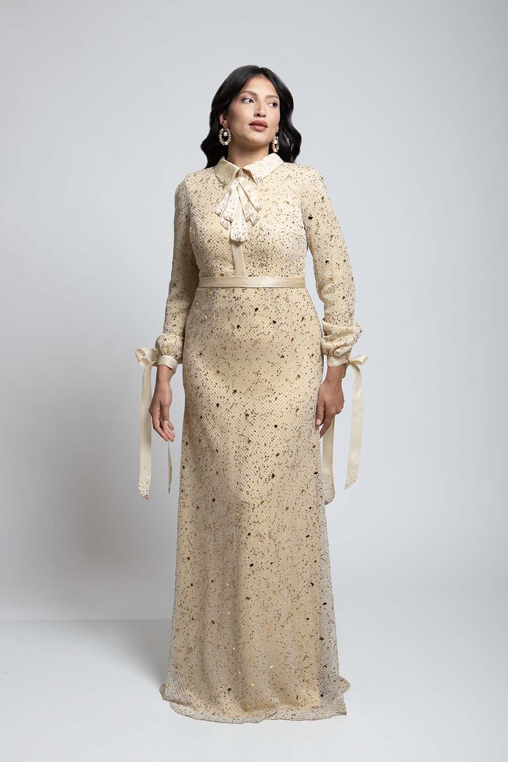 Élaborée dans un tissu somptueux serti de cristaux Swarovski et de pièces miroir, cette robe scintille avec élégance à chaque mouvement. Sa coupe fluide, doublée de soie naturelle, épouse la silhouette avec raffinement et douceur.