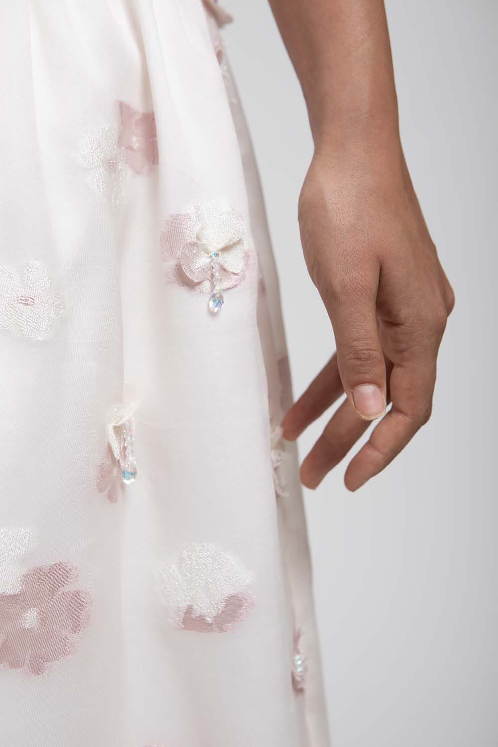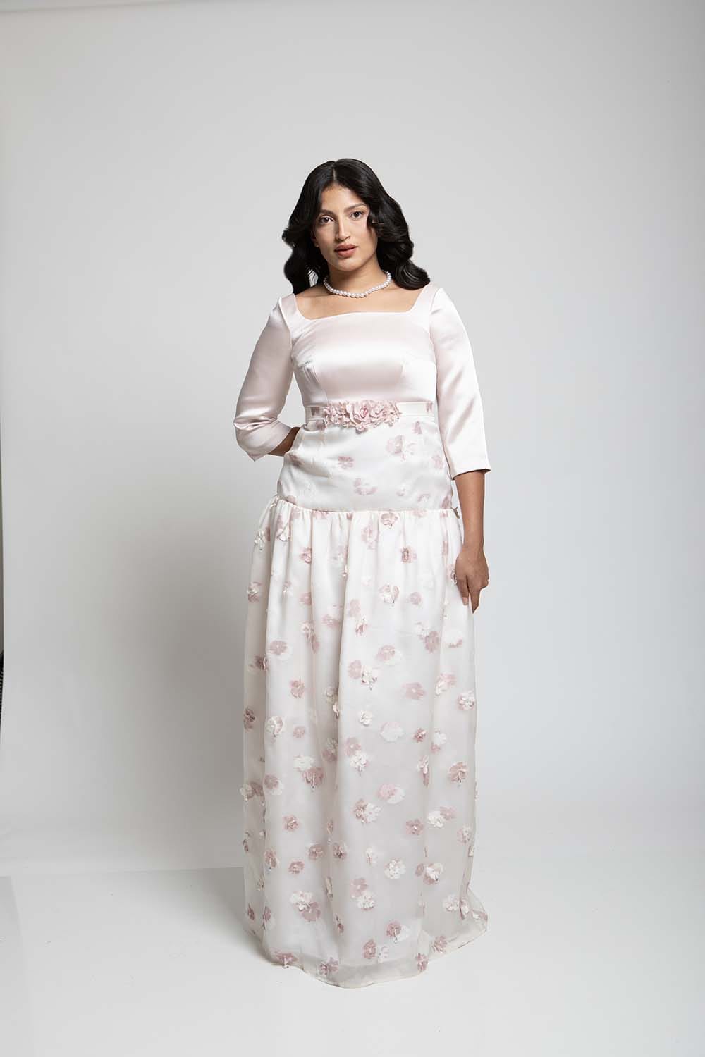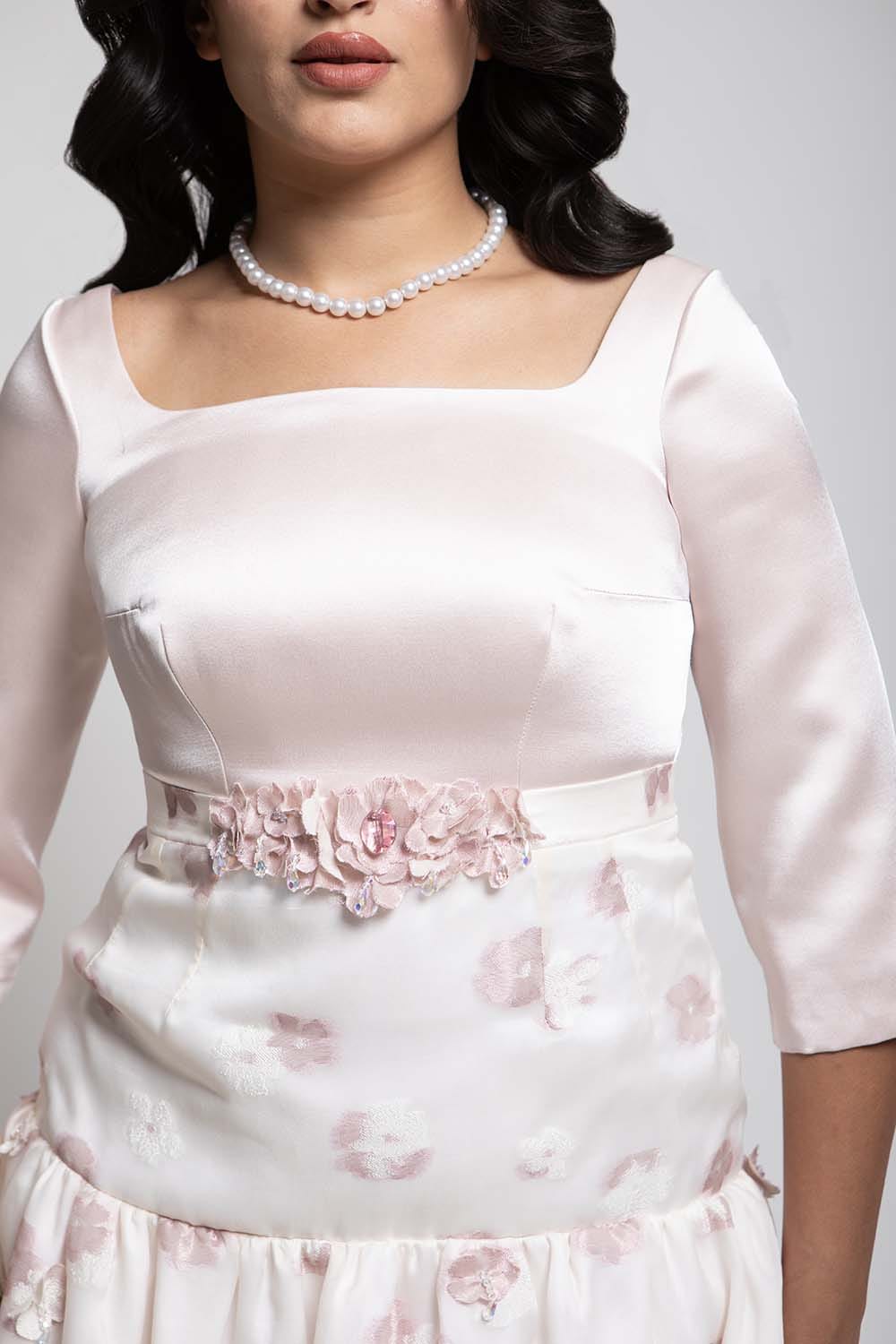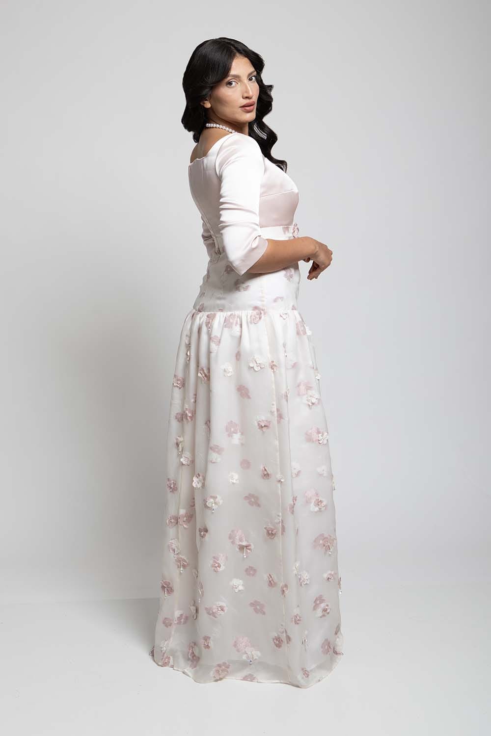 Robe élégante au volume raffiné, réalisée en trois étoffes de soie noble et comprenant un corsage doublé en soie.Ornée de délicates broderies florales en relief et de véritables cristaux Swarovski, avec une ceinture décorée pour une allure féminine et raffinée.