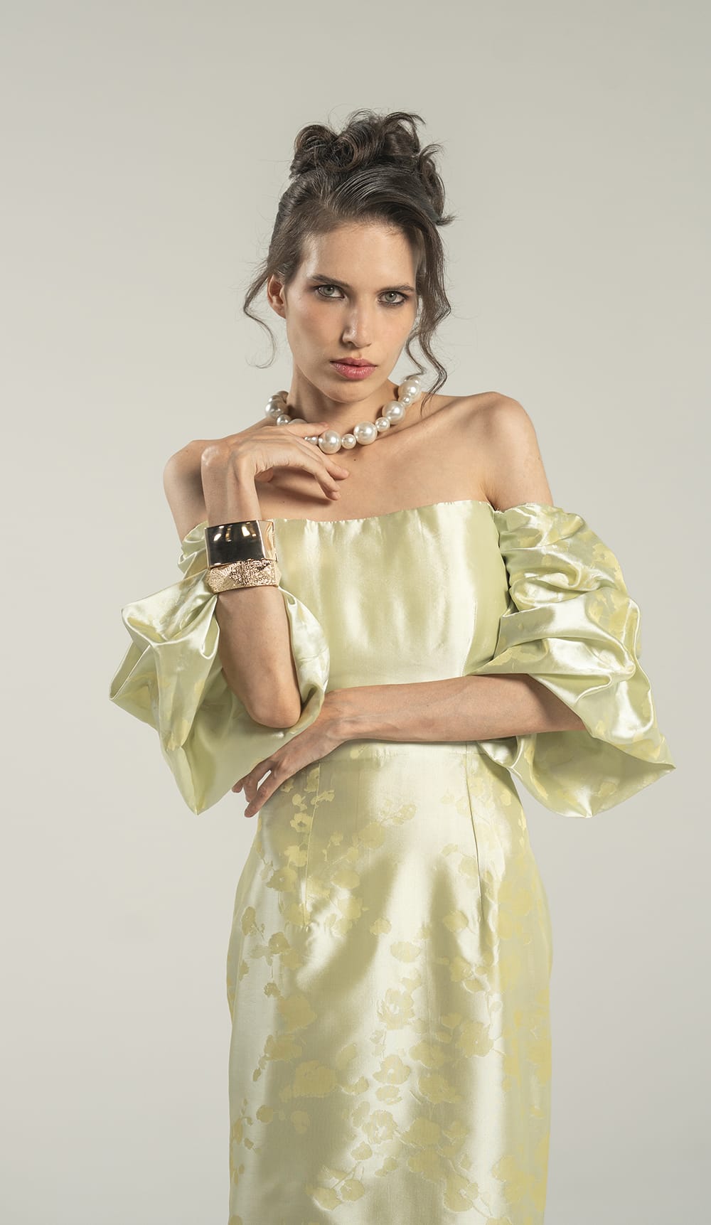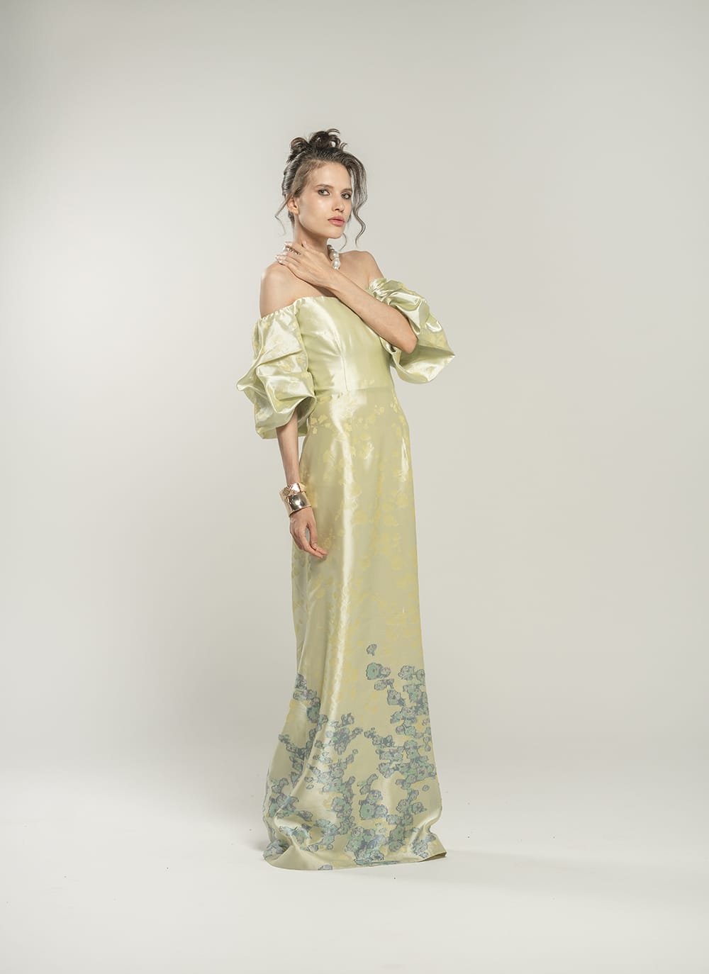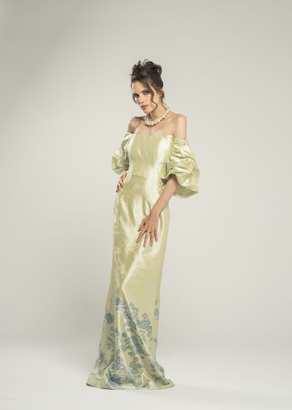 Ses manches sculptées apportent une élégance dramatique, tandis que ses motifs délicats révèlent une poésie textile rare.