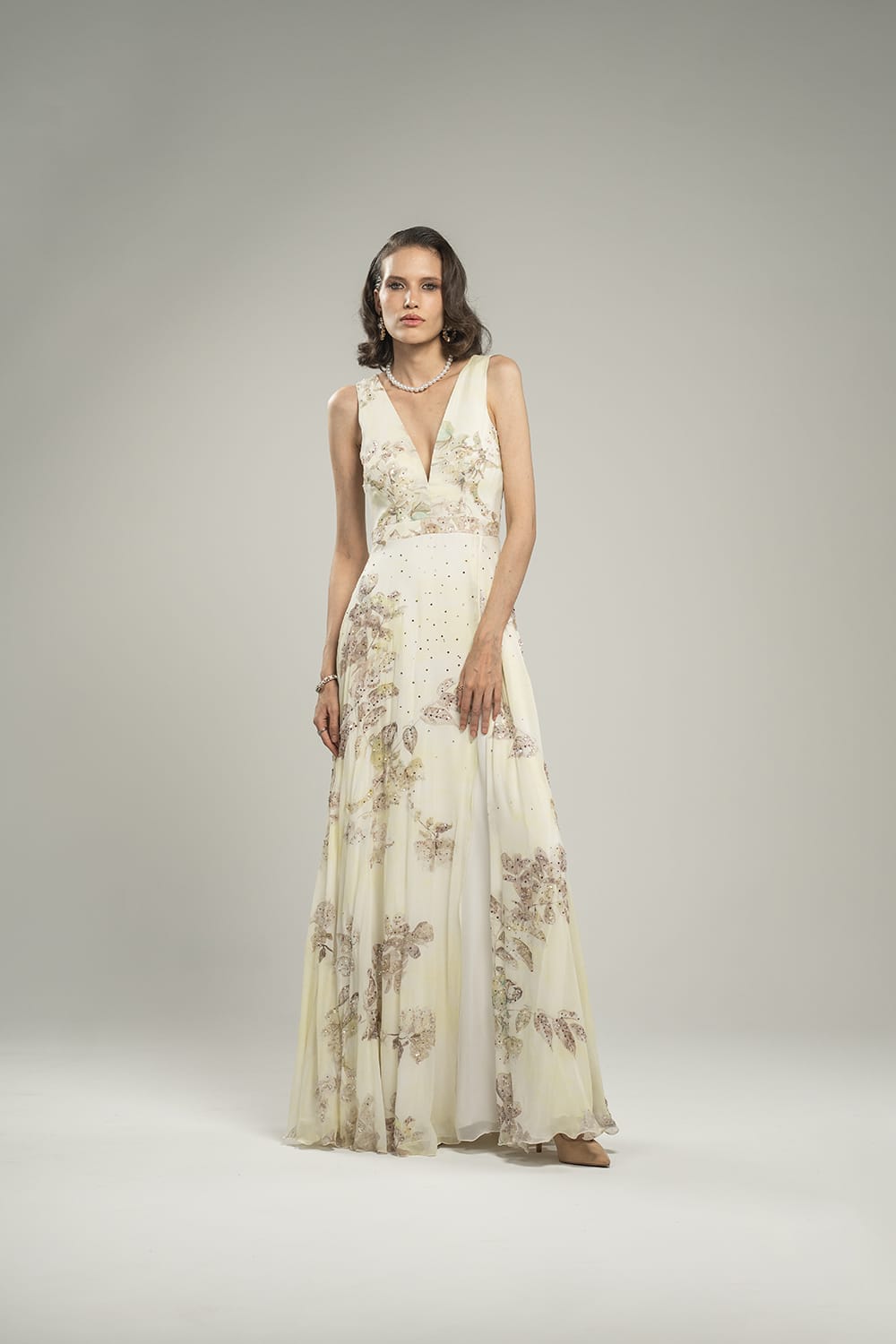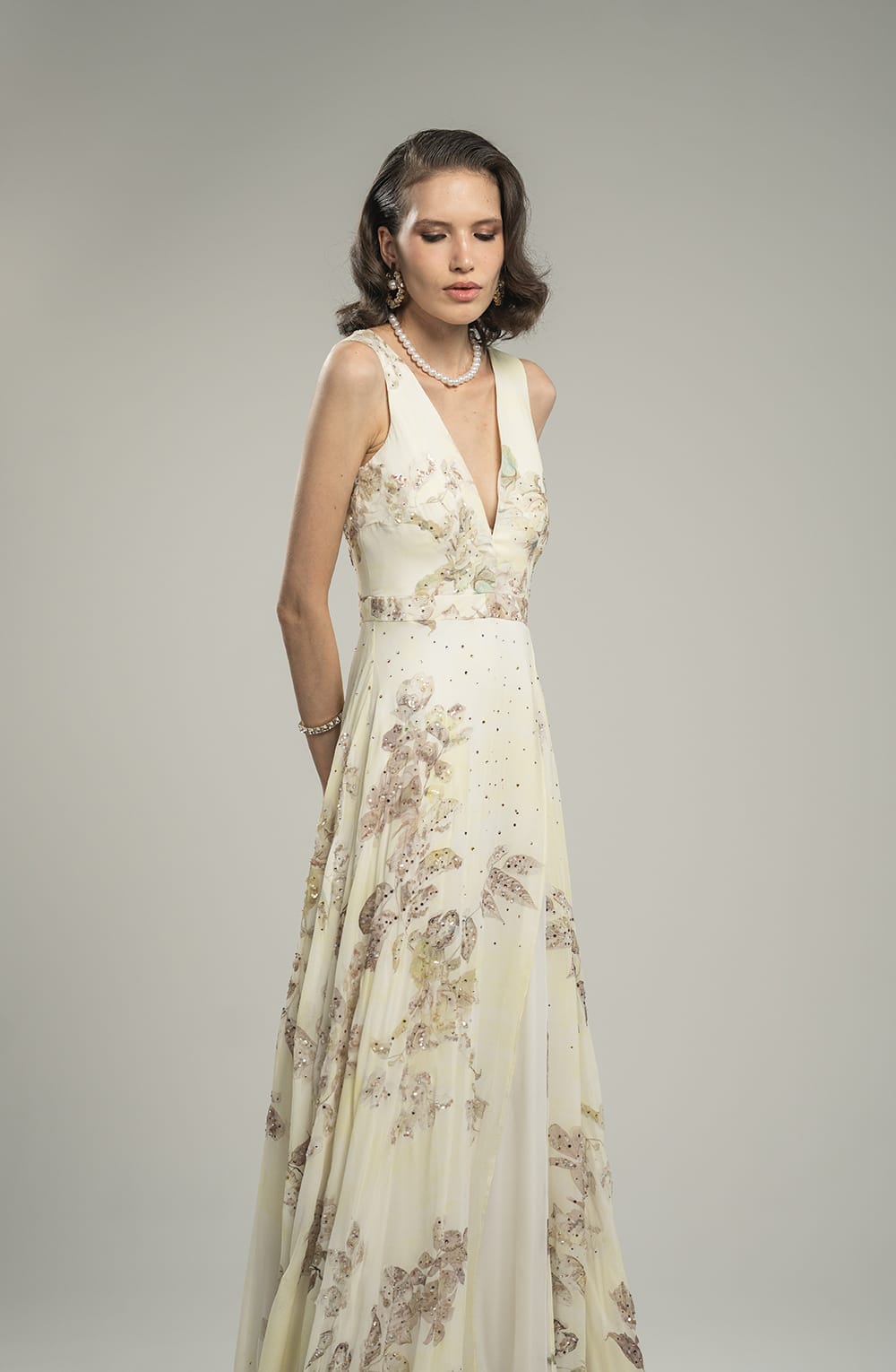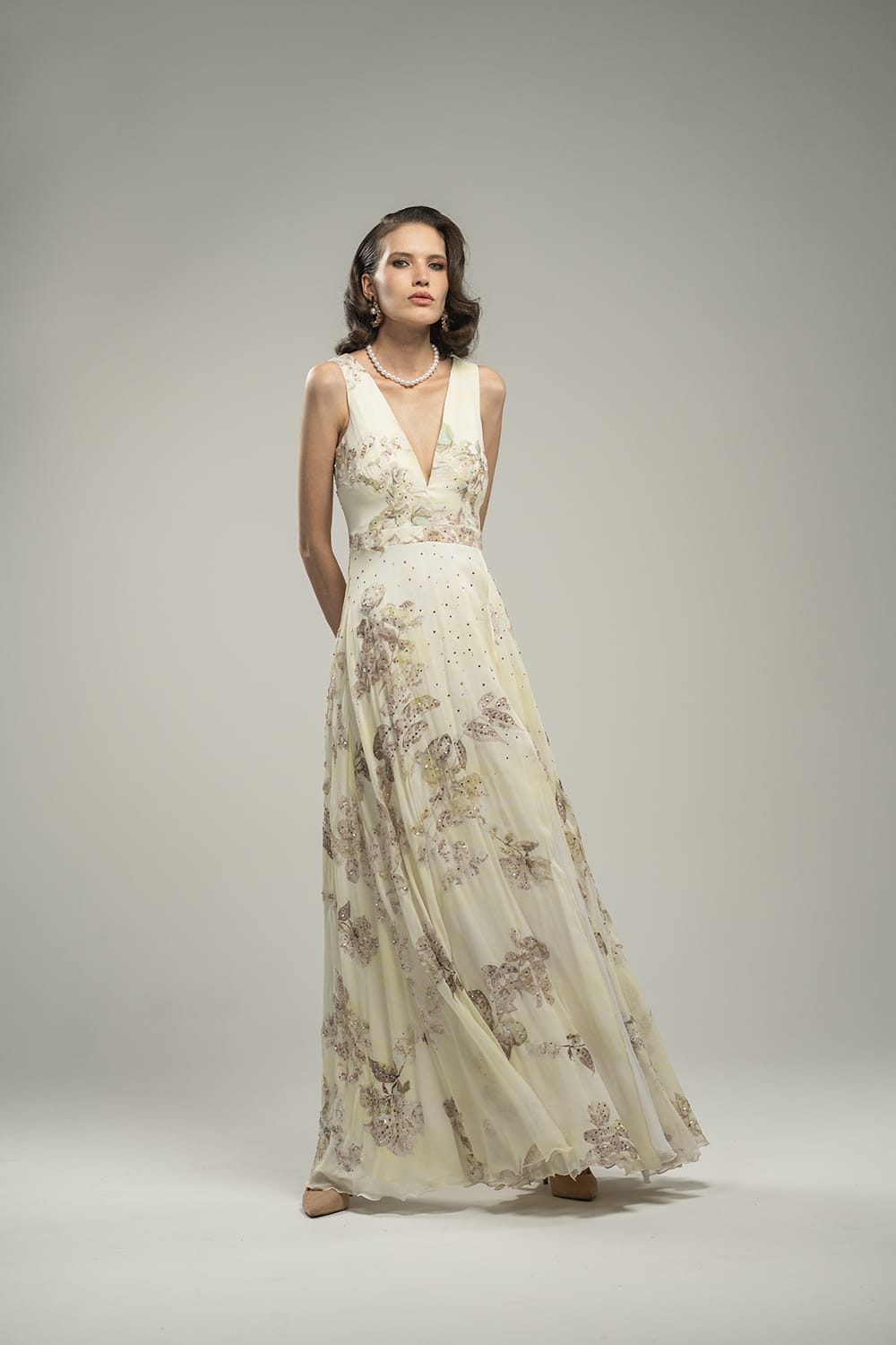 Confectionnée dans une soie précieuse, cette robe révèle une douceur exquise et une fluidité naturelle. Sa coupe élancée et ses détails délicats traduisent un savoir-faire raffiné, offrant une allure empreinte de grâce et d’élégance intemporelle.